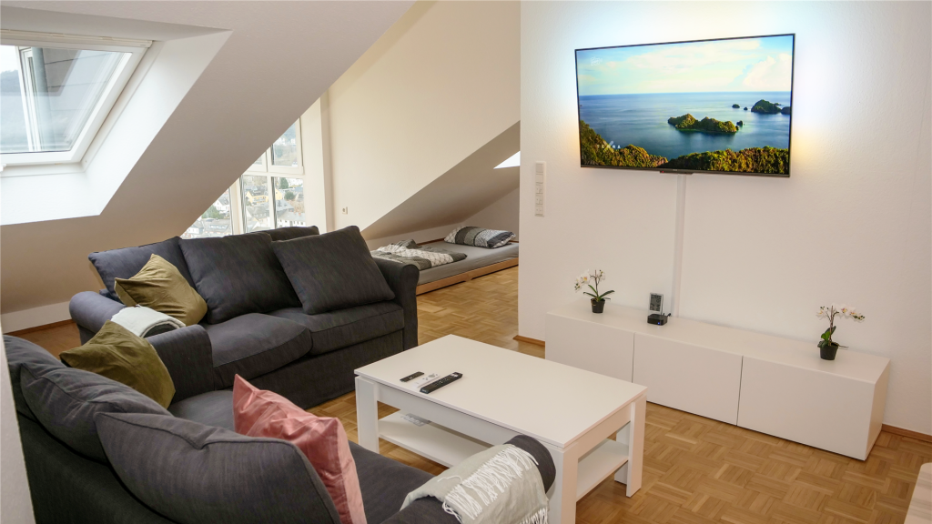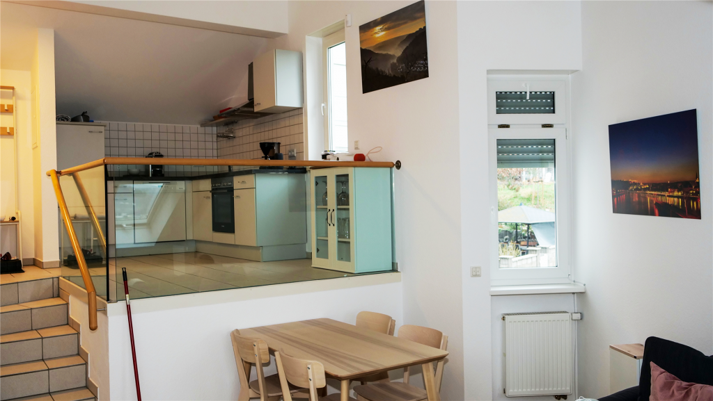 der Grundriss ist offen. Sie können vom Wohnbereich und vom Schlafbereich aus ins Rheintal blicken. Beide Bereich sind offen miteinander verbunden. Die Küche befindet sich auf einem erhöhten Level über dem Wohnbereich (Splitlevel). Das Badezimmer mit Dusche und WC ist mit einer Tür vom Wohn-Ess-Schlafbereich abgetrennt.